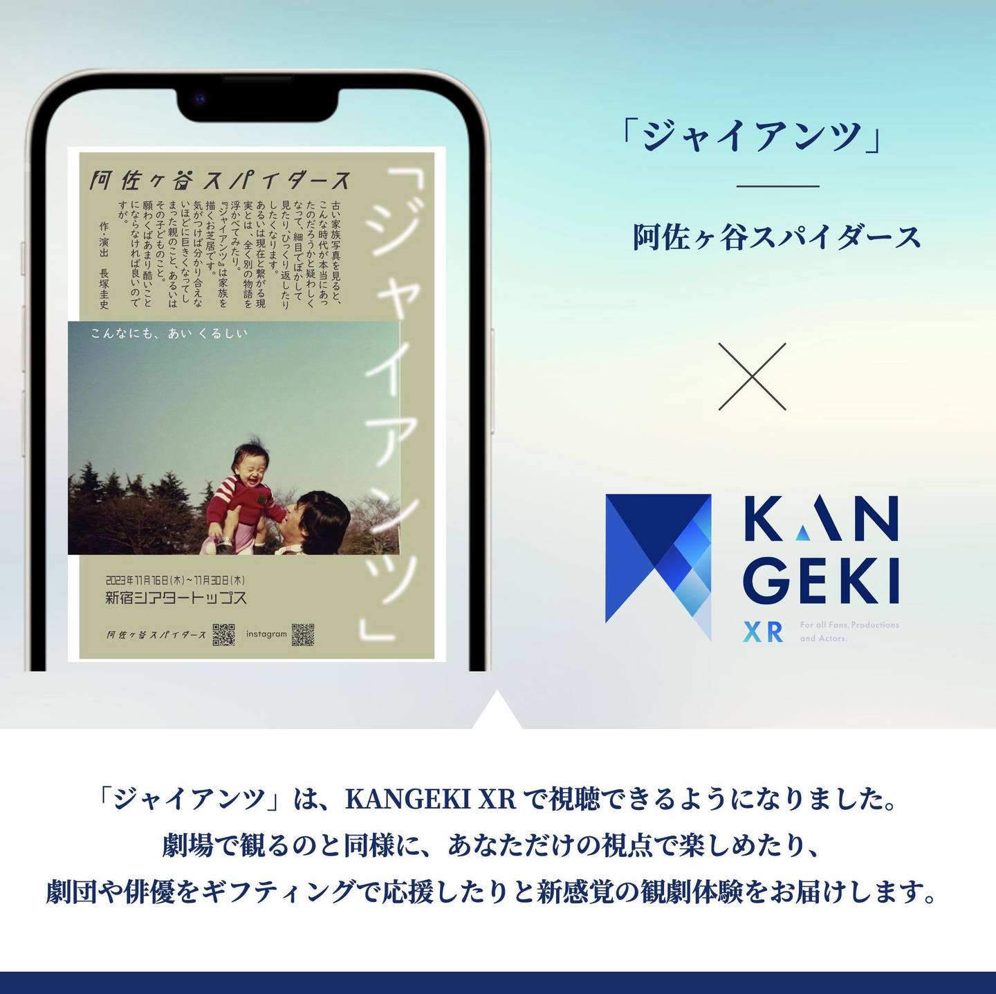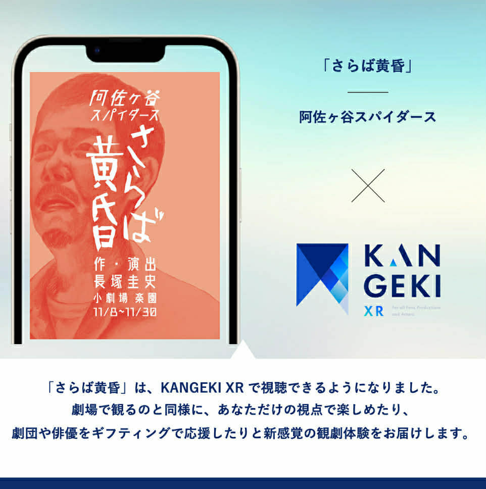 KANGEKI XR(カンゲキエクスアール)は、演劇作品を場所や時間を選ばずにスマホでお楽しみいただけるスマホアプリです。