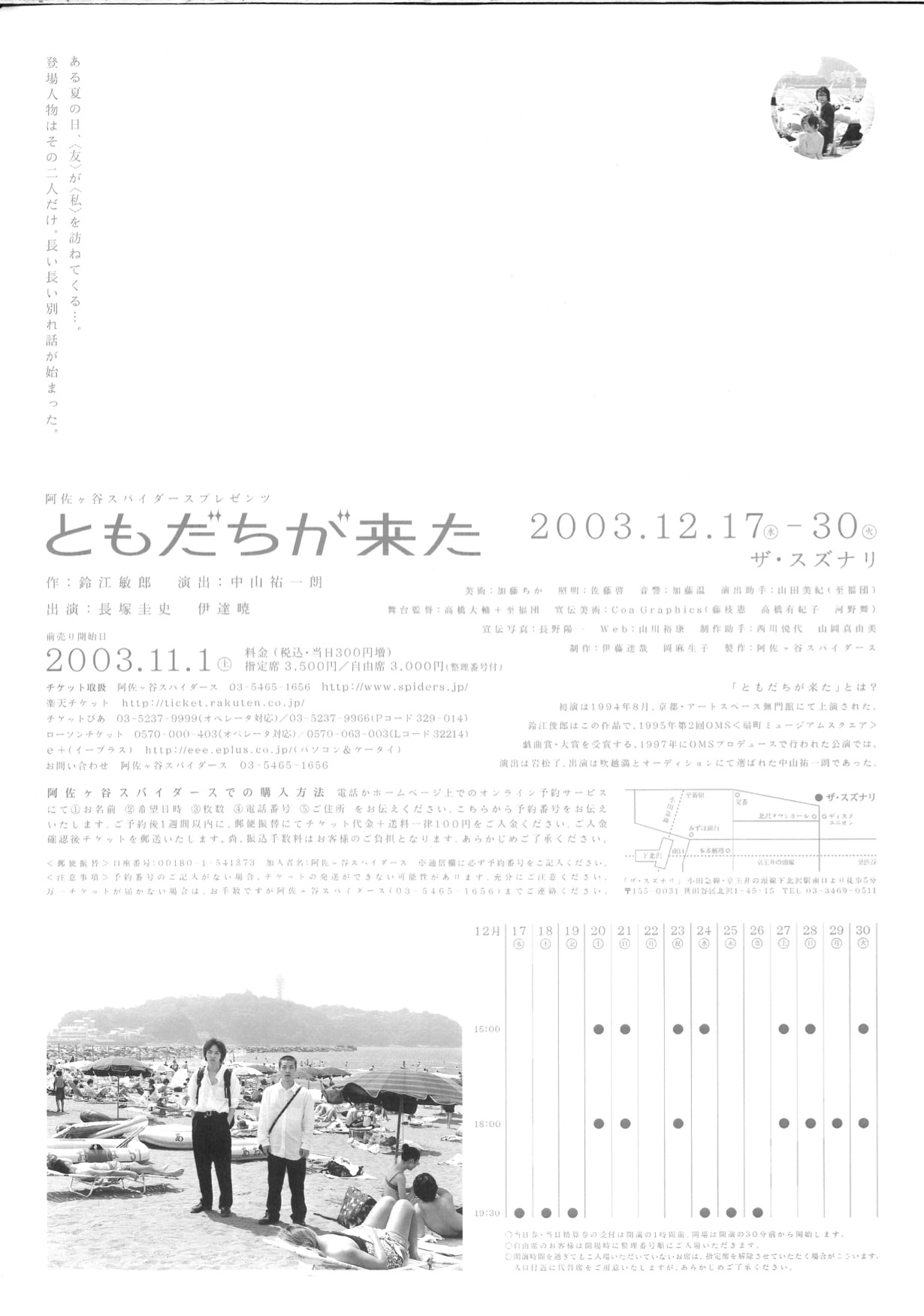 初演は1994年8月、京都・アートスペース無門館にて上演された。鈴江俊郎はこの作品で、1995年第2回OMS <扇町ミュージアムスクエア>戯曲賞・大賞を受賞する。1997年にOMSプロデュースで行われた公演では、演出は岩松了、出演は吹越満とオーディションにて選ばれた中山祐一朗であった。