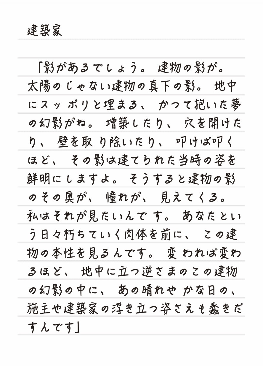 実際に私が西大井のご自宅へ訪問し、そこで能作氏と話しながら建物を体感、そこから「科白」を紡いだのです。もちろんそのような体験はこれまでになく、一体そんなことが可能なのかどうか大いに疑問だったのですが、いやつまり、断片的な「科白」の一部がそこに立ち上がっても、鑑賞者にとっては詩ほどの感銘を与えることは出来ないだろうと予想したのですが、それならば一編の本編を創り出し、その一部を抜粋するような形で「科白」を生み出せば良い。そうすればその「科白」は一部の切り取られた状態であっても、その背景に戯曲の世界を抱くのだから、強く響くこともあるのかもしれない。